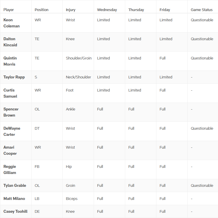Key Players: QB Josh Allen, RB James Cook, TE Dalton Kincaid, WR Amari Cooper, Khalil Shakir, EDGE Gregg Rousseau, CB Christian Benford & LB Matt Milano